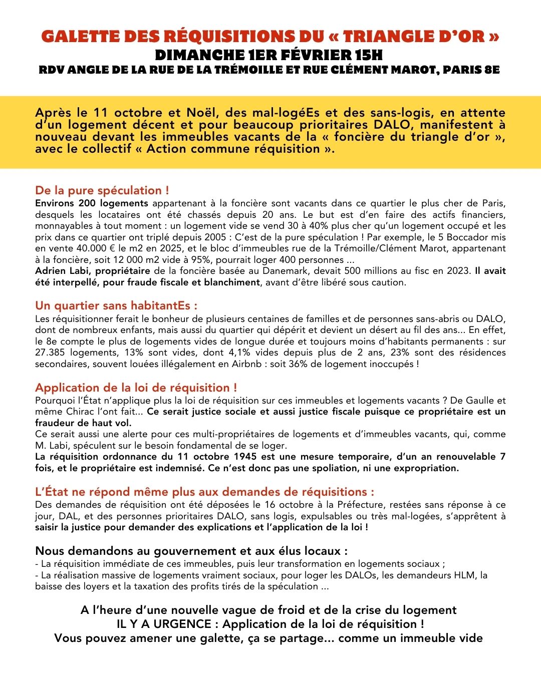 cpPublié 22 janvier 2026 aux dimensions 1080 × 1350 dans Galette des réquisitions le 1er février dans le triangle d’or. ← Précédent https://www.droitaulogement.org/wp-content/uploads/2026/01/Affiche-et-texte-25-janv-galette-réquis-insta-819x1024.jpg https://www.droitaulogement.org/wp-content/uploads/2026/01/cp-819x1024.jpg